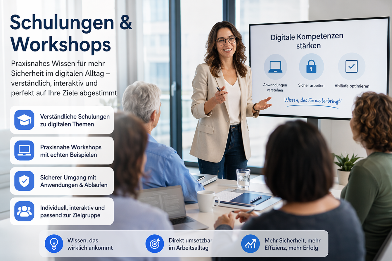Verständliche Schulungen zu digitalen Themen, Anwendungen und sicheren Abläufen. Praxisnah und passend zur Zielgruppe.